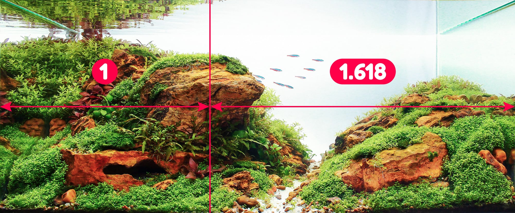In both art and mathematics as well as in nature, the golden ratio is strictly connected with the creation of a focal point. In aquascaping, this would be the point the eye is directed towards at a first glance.